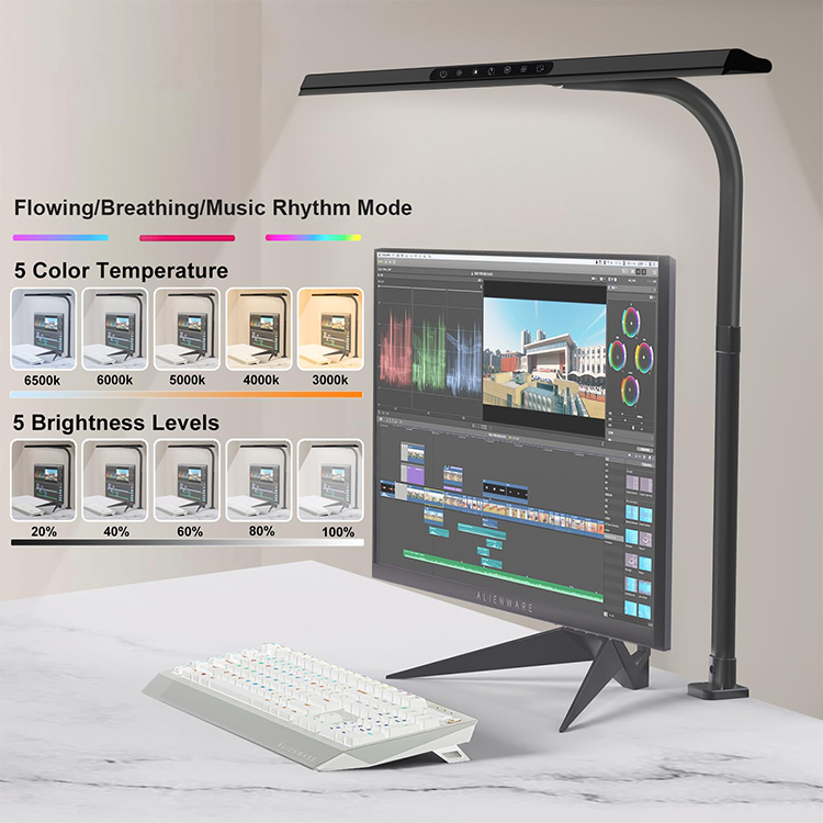 2-ইন-1 ডেস্ক ল্যাম্প আরজিবি অ্যাম্বিয়েন্ট লাইট বৈশিষ্ট্যের সাথে পিজাজের স্পর্শ যোগ করতে পারে। কাস্টমাইজযোগ্য রঙ এবং উজ্জ্বলতার মাত্রা সহ যে কোনও কাজ বা মেজাজের জন্য একটি দুর্দান্ত পরিবেশ তৈরি করুন . এর সামঞ্জস্যযোগ্য নকশা আলোর কোণ নিশ্চিত করে এবং দীর্ঘ কাজের সময় চোখের ক্লান্তি হ্রাস করে।